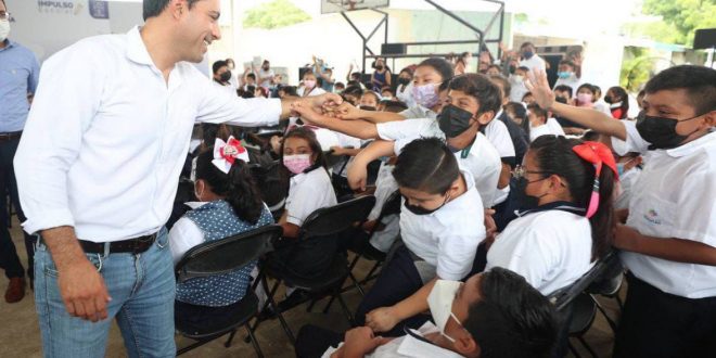 Vila Dosal recorrió las escuelas primarias “Ana María de los Ángeles Piña Azcorra” y “Emiliano Zapata”, ubicadas al sur de la ciudad, donde siguió con la distribución de estos apoyos que benefician a los 1,200 alumnos de los turnos matutino y vespertino de ambos planteles y que además respaldan la economía de las familias con un ahorro de 2,850 pesos por cada estudiante para los padres y madres de familia.
