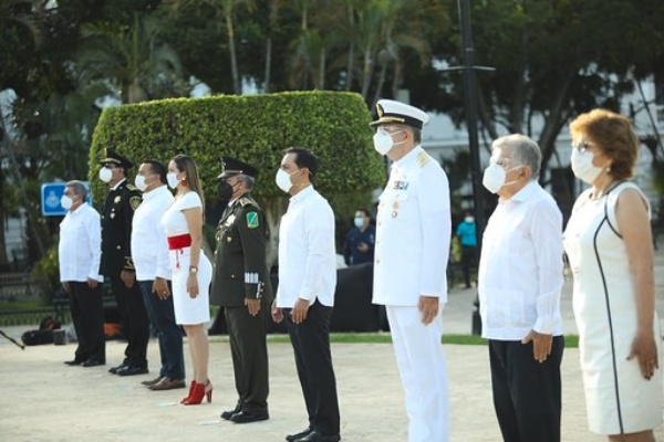 Tras izar el lábaro patrio, Vila Dosal y las demás autoridades presentes rindieron honores a la bandera nacional y para concluir entonaron el himno nacional mexicano, en una ceremonia que se llevó a cabo sin la presencia de público, ni invitados, como medida para evitar aglomeraciones, reducir riesgos de contagio de Coronavirus y proteger la salud de los yucatecos.