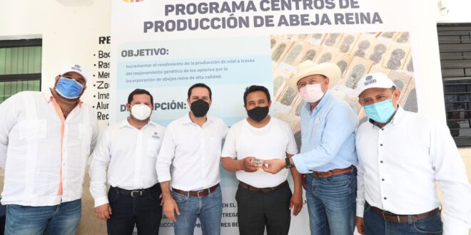 De igual forma, el Gobernador hizo entrega de paquetes de abeja reina del programa Centro de Producción de Abeja Reina, con el cual se está beneficiando a 86 apicultores de Tizimín con la entrega total de 1,250 obreras. A la fecha, se han entregado cerca de 14,000 de estos insectos en variedades como las Golden, Italiana y Carniola que mejoran la calidad y aumentan la producción hasta un 30% más por colmena de la miel yucateca.