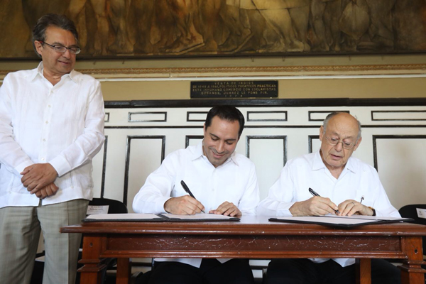 Desde el Salón de la Historia de la sede del Ejecutivo Estatal, el Gobernador Mauricio Vila Dosal y el consejero de dicha organización, Guillermo Güemez García, firmaron una carta compromiso, en cual se concreta esta colaboración que contribuye a disminuir el bajo rendimiento, el rezago y la deserción escolar; y que convierte al estado en el primero en el país en implementar una cobertura total a la población estudiantil.