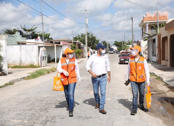 A temprana hora del día, Vila Dosal participó en las tareas que llevaron a cabo los “Amigos de Salud Casa por Casa” en este punto de la ciudad, quienes acudieron a los hogares y negocios para informar sobre las disposiciones preventivas, como el correcto lavado de manos, el buen uso del cubrebocas cubriendo nariz y boca para evitar contagios, así como mantener en todo momento una sana distancia y no acudir a fiestas ni reuniones, para evitar que sigan aumentando los contagios.