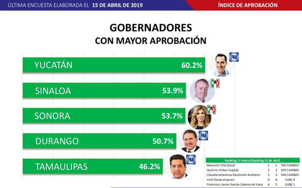 Mauricio Vila ocupa el primer peldaño con el 60.02 % se aprobación, seguido por el gobernador de Sinaloa con 53.9; Sonara 53.7; Durango 50.7 y Tamaulipas con 46.2.