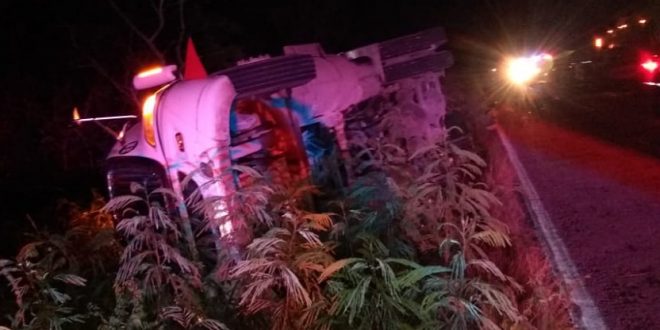 En su afán de incorporarse a su carril terminó invadiendo el lateral opuesto para colisionar de un costado de similar vehículo a cargo de Héctor Misael Pech Kantún, de 31 años, vecino de Hunxectamán, comisaría de Umán; quien iba cargado con alrededor de 40 toneladas de comida para cochinos. Héctor alcanzó a volantear a tiempo, pues el choque iba a ser de frente. Por lo que el impacto fue al costado izquierdo de la tolva de Pech Kantún, provocando que vuelque sobre su costado derecho para esparcir casi toda la carga.