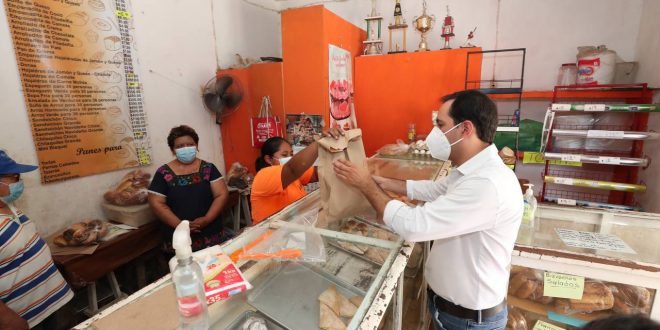 Después de supervisar la aplicación de segundas dosis a los adultos mayores, Vila Dosal acudió a este tradicional negocio familiar para comprar unos panes dulces y disfrutarlos en su regreso a la ciudad de Mérida, donde continuó con sus actividades de este día.