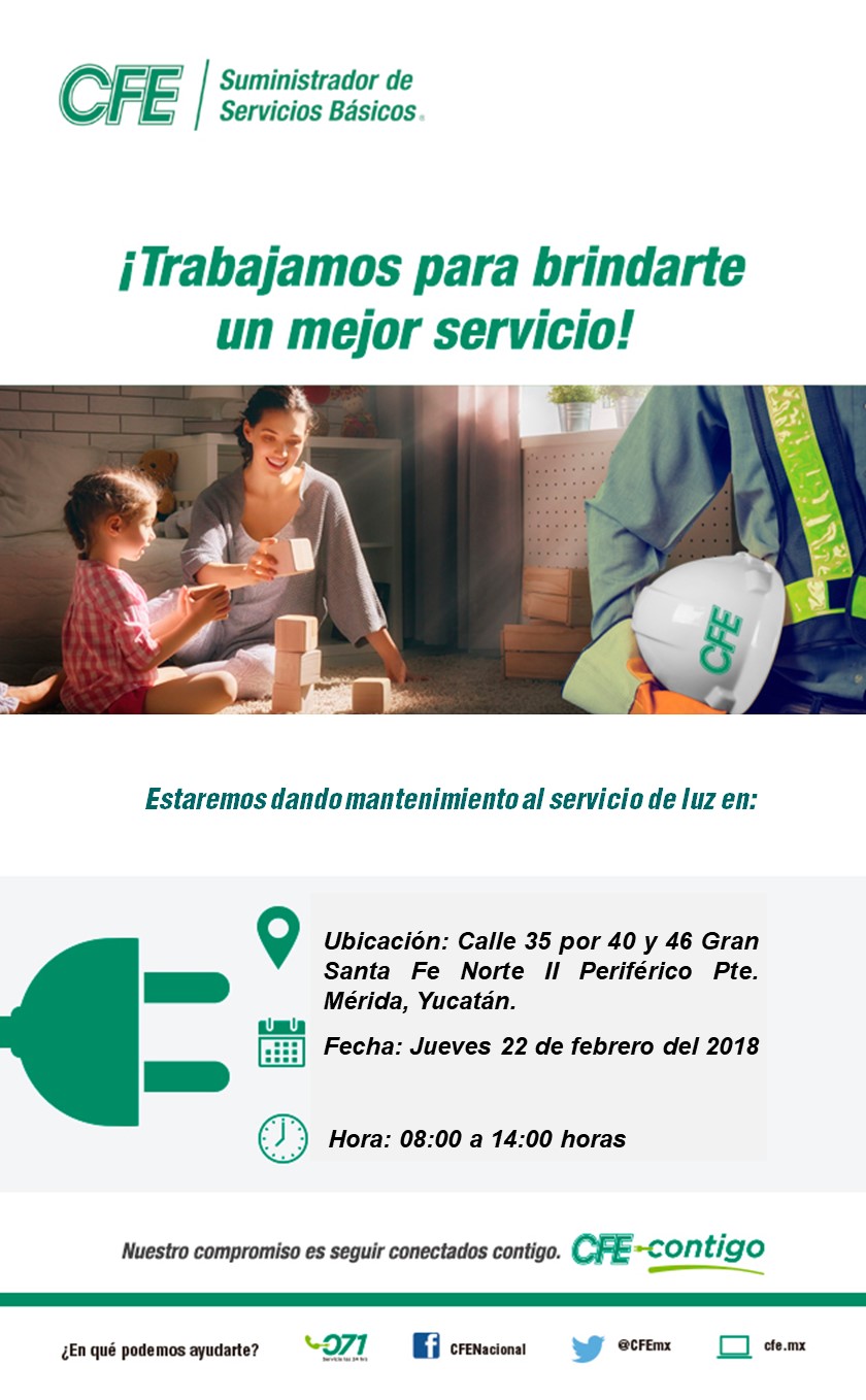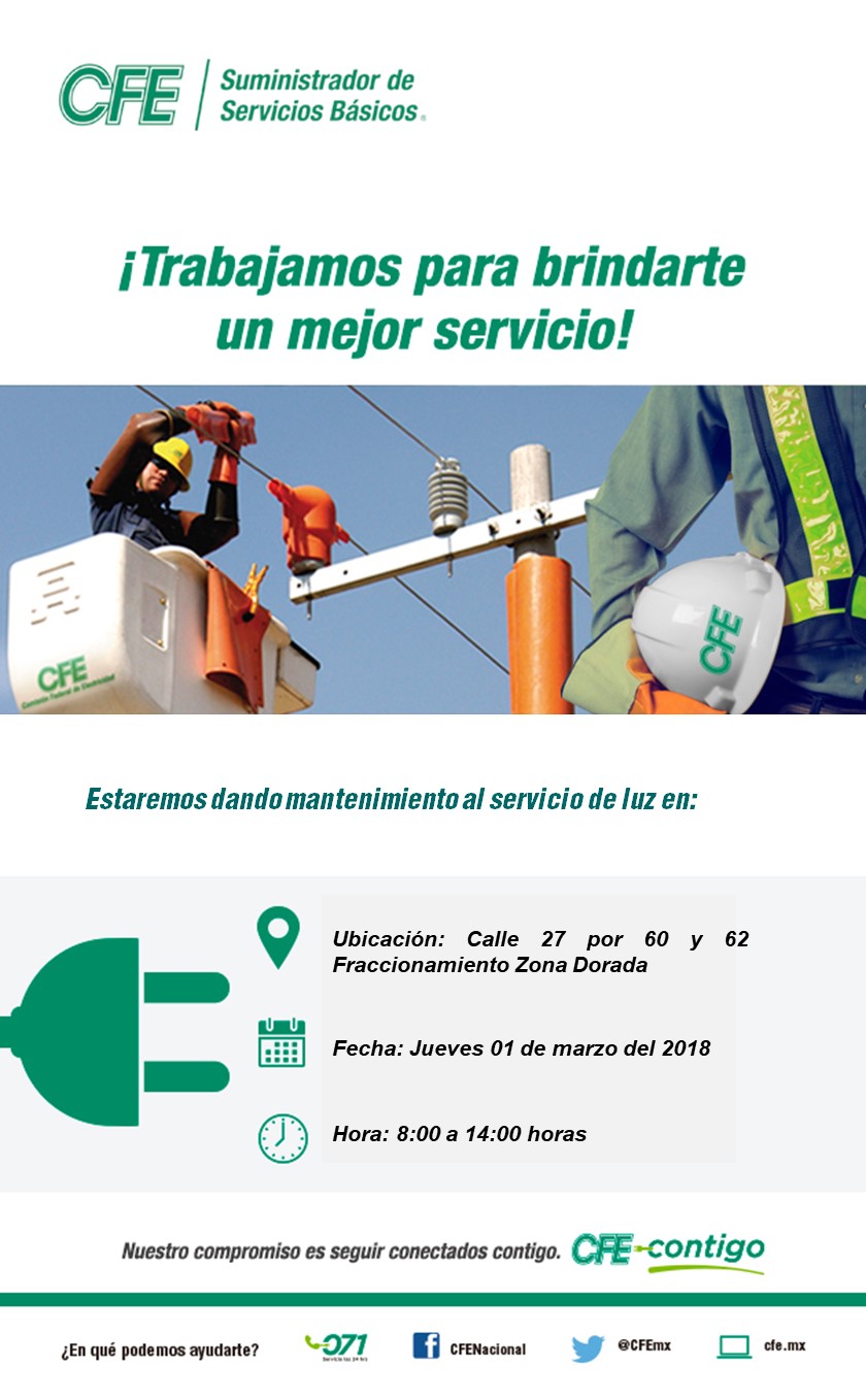 La Comisión Federal de Electricidad (CFE), a través de comunicado de prensa informó que por los trabajos de libranza se suspenderá el servicio de energía eléctrica el día de mañana 22 de febrero en Gran Santa Fe Norte II Periférico Poniente y para el miércoles 01 de marzo en el Fraccionamiento Dorada.