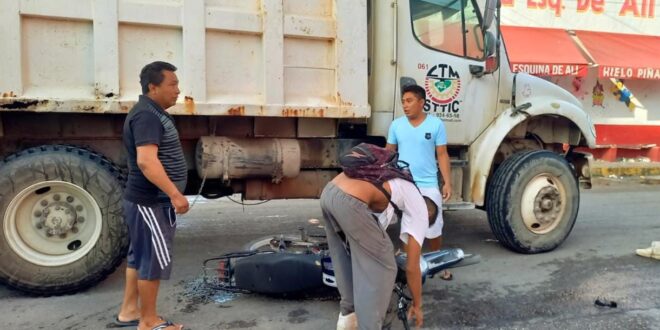 Vivió para contarlo: Motociclista se impacta contra un camión de volteo en Kinchil