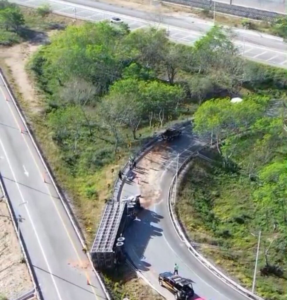 Mérida, Yuc., 06 de marzo 2026.- La mañana de este lunes se registró la volcadura de un camión que transportaba cerdos sobre el Periférico de la ciudad, a la altura del distribuidor vial ubicado en la zona oriente, cuando la unidad se dirigía hacia el ingreso a la capital yucateca.