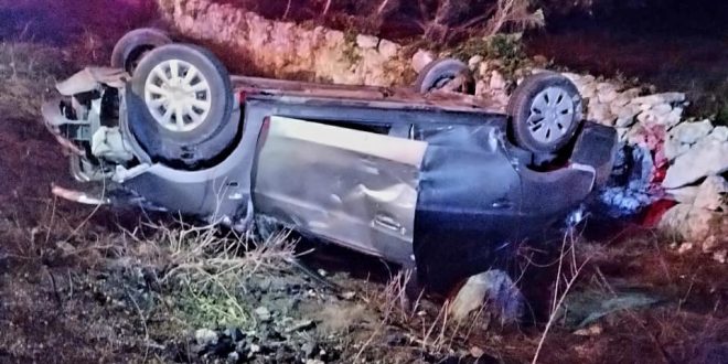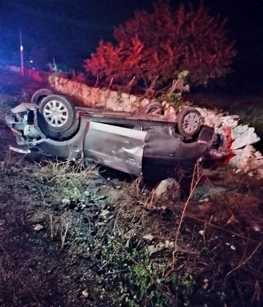 En su loca carrera, se estrelló con la albarrada de la granja Chencopó, y terminó con las llantas del carro hacia arriba.