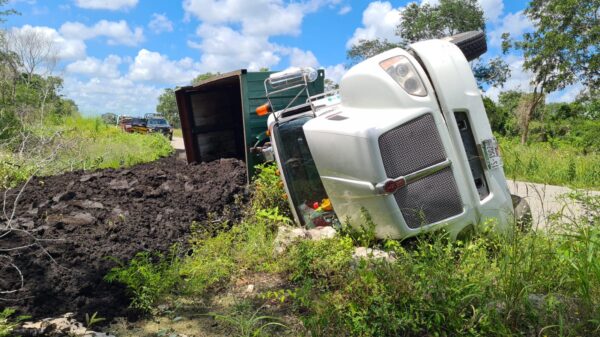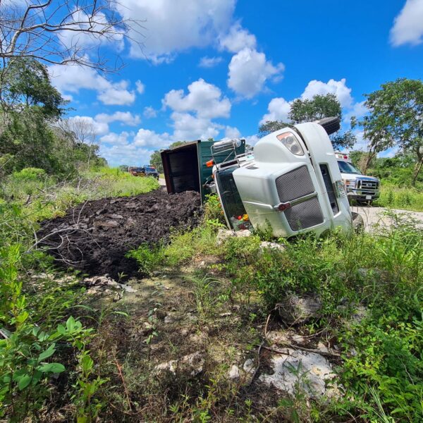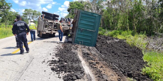 Kinchil, Yuc., 30 de septiembre 2021.- Quedó más que “aromatizada” la carretera Kinchil-Celestún tras volcar un camión cargado con 14 toneladas de excremento de cerdo, dejando una alfombra negra a la orilla de esta vía federal.
