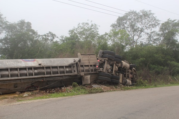 Samahil, Yuc., 29 de junio.- Por fallarle los frenos a una pesada unidad de Crío, causó que el operador pierda el control y acabe volcaldo la mañana de ayer domingo en la curva cerrada del tramo de la comisaría Tamchén – Tixnuc.