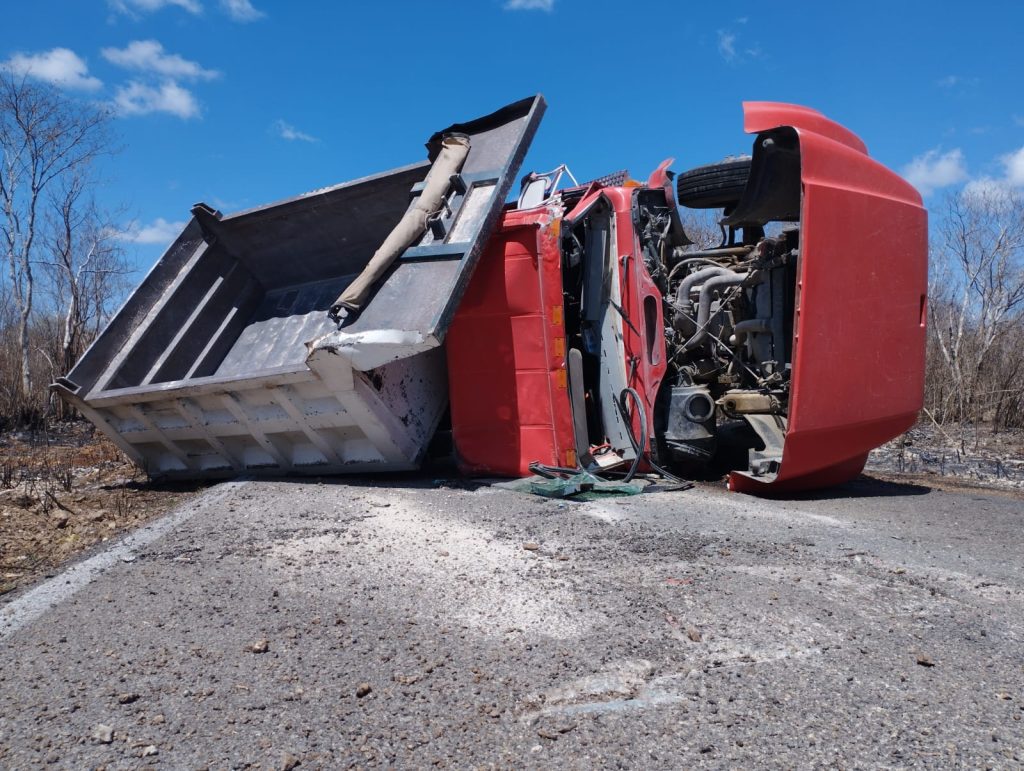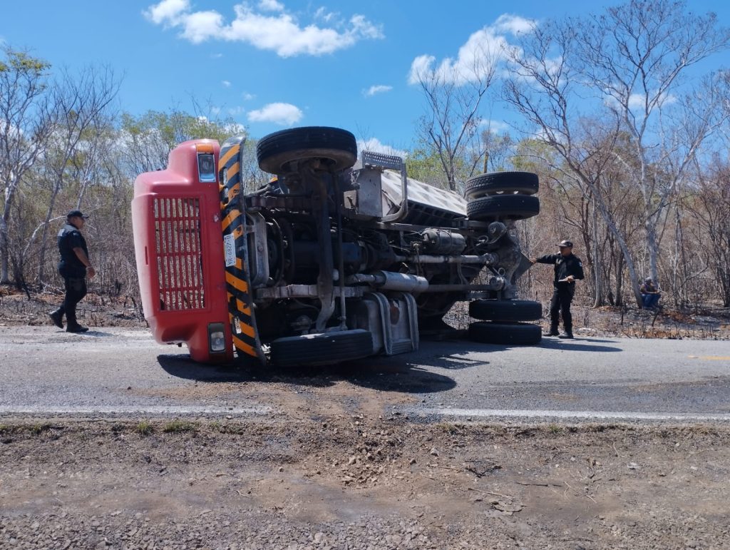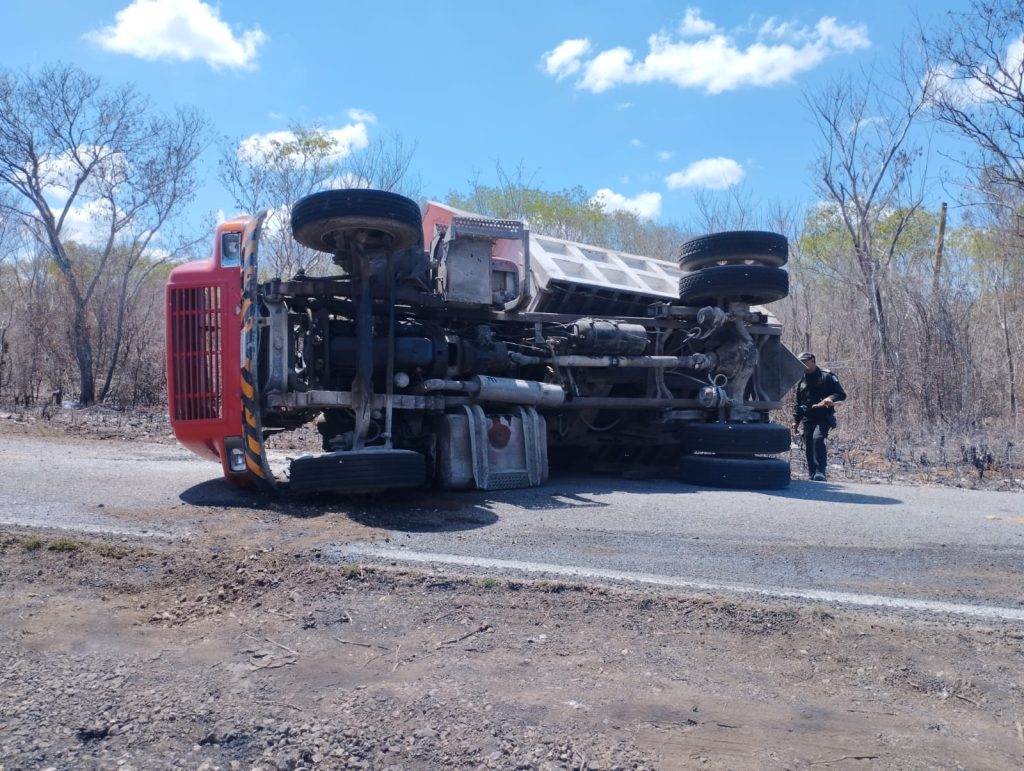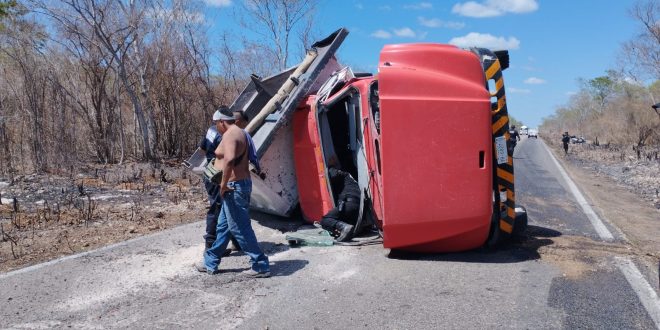 Kinchil, Yuc., a 4 de junio.- Vuelve a ser noticia el tramo salado de la Kinchil-Celestún, al suscitar una aparatosa voladura de un camión de volteo al “pellizcar” el borde del pavimento, a altura del kilómetro 50+500,