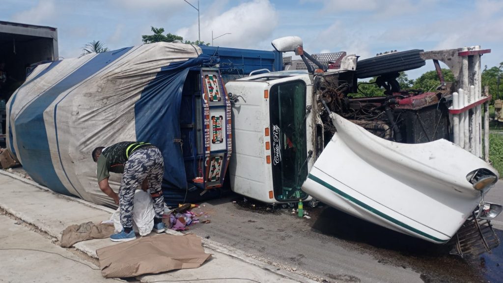 Los hechos se dieron cuando el conductor de la pesada unidad , dormitó unos segundos en una curva y perdió el control de su unidad saliéndose de la vía para terminar volcado sobre su costado.