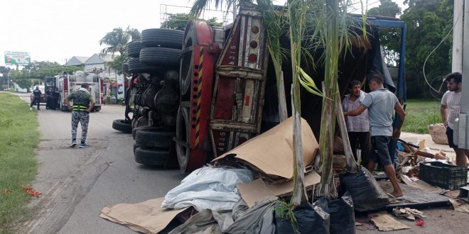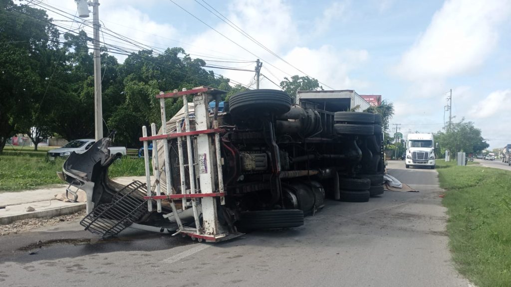 Merida,Yuc. 11 de septiembre 2024.- Un tortón cargado con plantas y cerámica terminó volcado en el km 17 del periférico de Mérida.