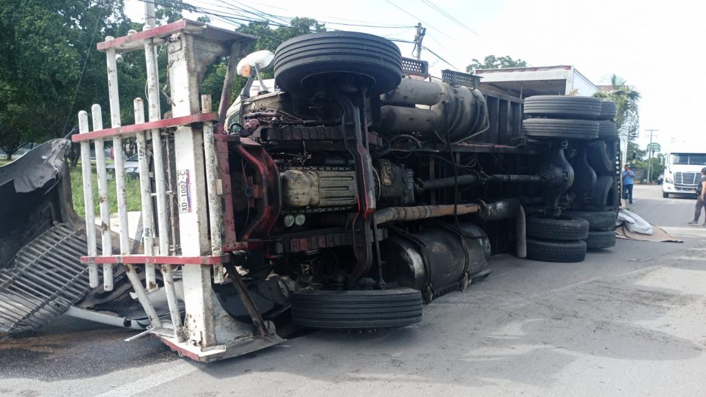 Los hechos se dieron cuando el conductor de la pesada unidad , dormitó unos segundos en una curva y perdió el control de su unidad saliéndose de la vía para terminar volcado sobre su costado.