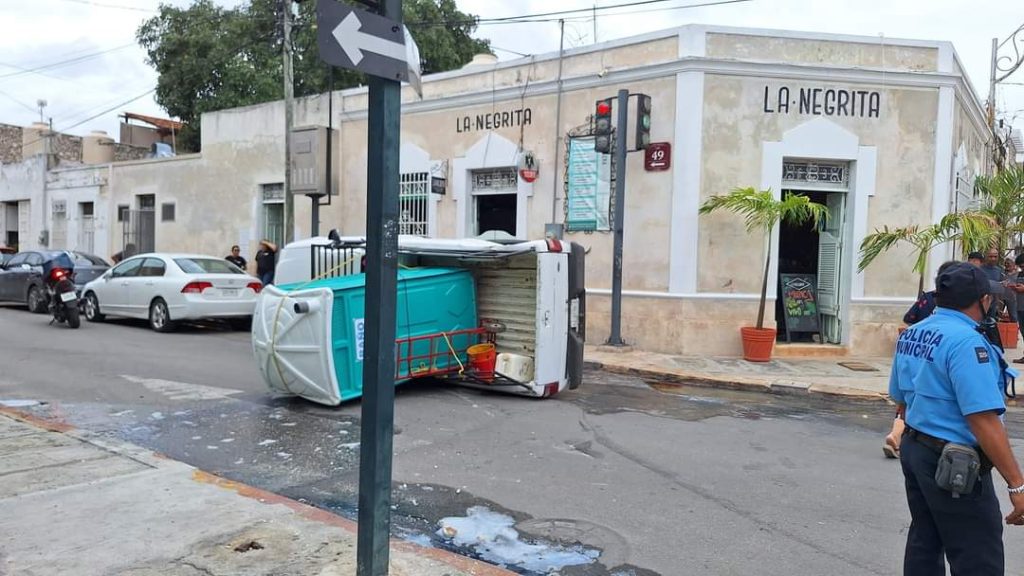 Vuelca camioneta que transportada baño portátil en el centro de Mérida
