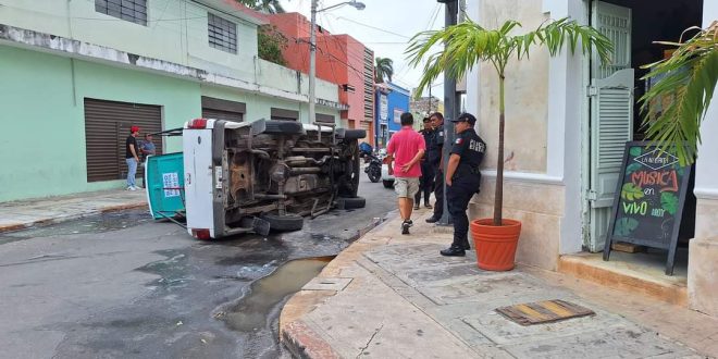 Home / Destacada policía / Vuelca camioneta que transportada baño portátil en el centro de Mérida
