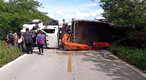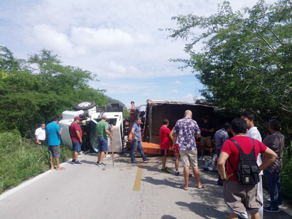 El percance ocurrió a la altura del kilómetro 72+200, donde arribaron elementos estatales comisionados del entronque de Chunchucmil, situado a escasos 2 kilómetros del lugar de los hechos. Se supo que el operador de esta mole de acero, presuntamente dio el clásico pestañazo, luego de laborar en el puerto y acabar volcando de costado derecho.