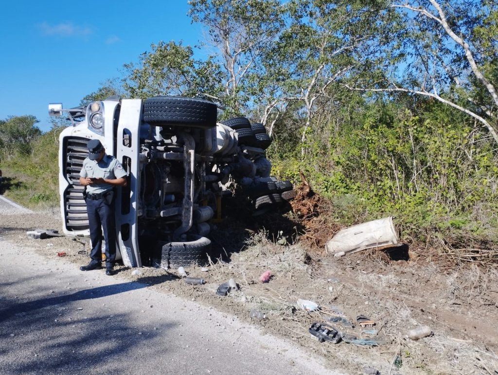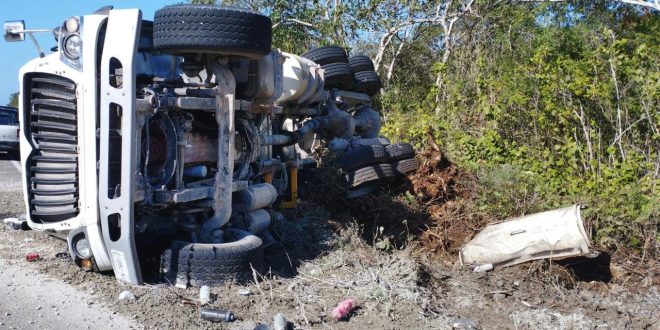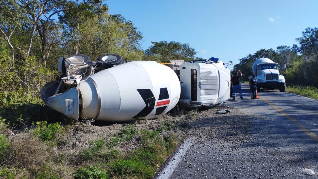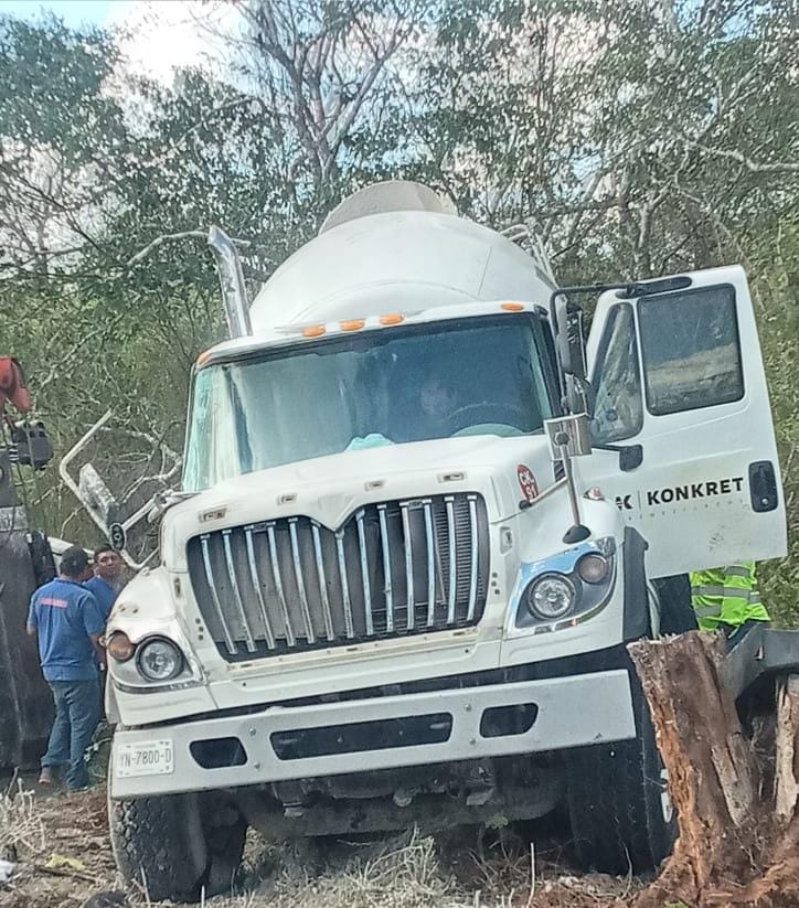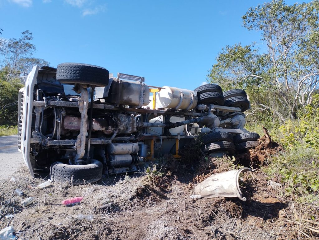Kinchil, Yuc., a 26 de enero.- Una dramática volcadura de un camión revolvedora se registró esta miércole en la carretera federal Kinchil-Celestún, para sumar uno más a la lista en este tramo peligroso.