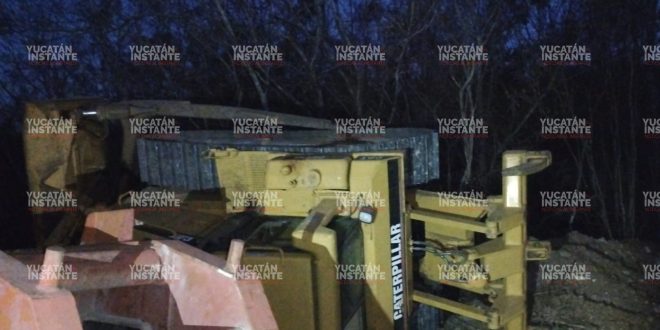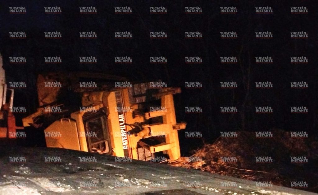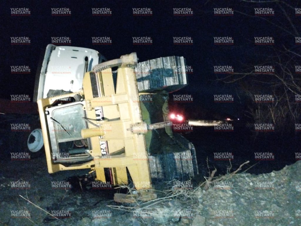 Kinchil, Yuc., a 01 de junio 2023.- De plano que la vía federal Kinchil-Celestún, de todo puede pasar, resulta que la tarde-noche de éste miércoles una maquinaria pesada realizaba trabajos de desmonte, pero al trepar un montículo de escombro acabó volcando de costado, justo a la altura del kilómetro 51.