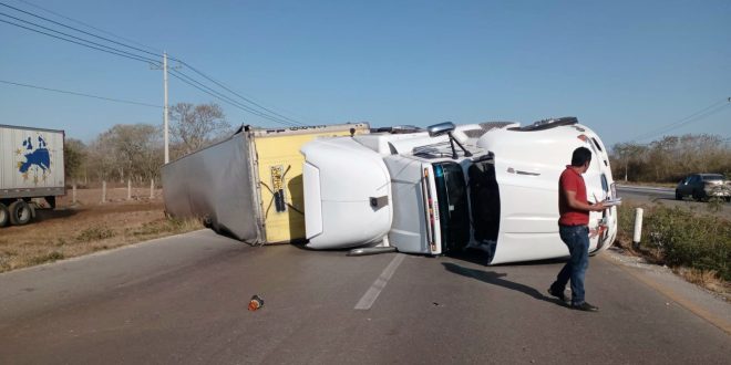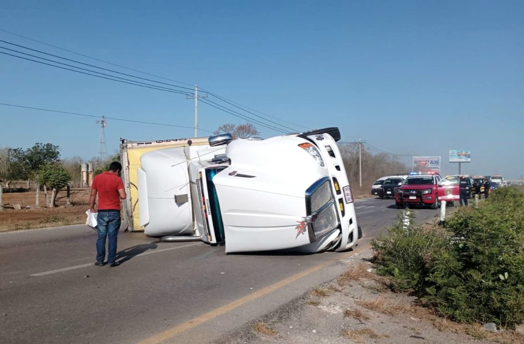Al parecer, el operador del armatoste dormitó y perdió el control del volante, hasta volcar y acabar ‘tapando’ a lo ancho los carriles de circulación, un kilómetro después del puente en el desvío a Acanceh.