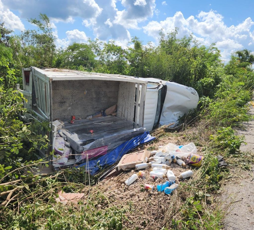 El conductor identificado como Eliseo del “Ranchito” iba a bordo de la unidad Nissan NP300 con placas YR0325D, con rumbo a su natal Celestún cuando de repente salió un vehículo en dicho cruce, cuya conductora no hizo su alto. El chófer en una maniobra defensiva perdió el control de su unidad y terminó volcado sobre el costado derecho, donde parte del material de construcción y mercancía para su súper, se desparramo en la cama.