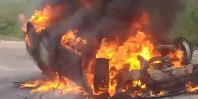Home / Destacada policía / Vuelca y se incendia su vehículo en la Mérida-Cancún, se salva de milagro