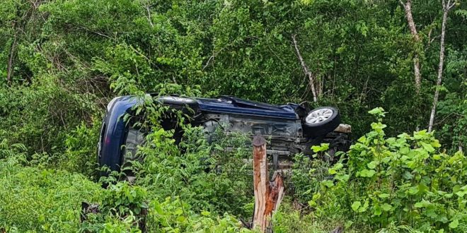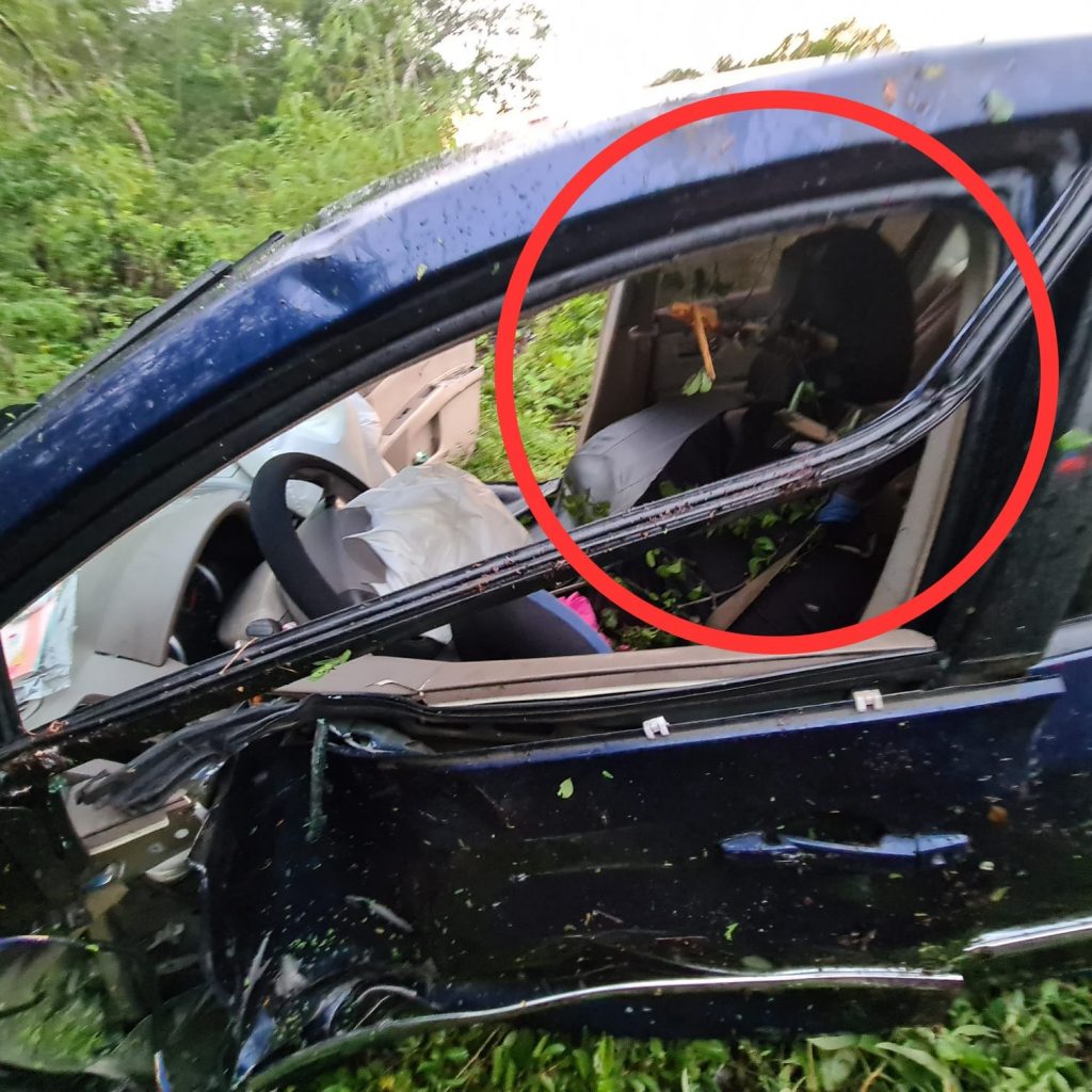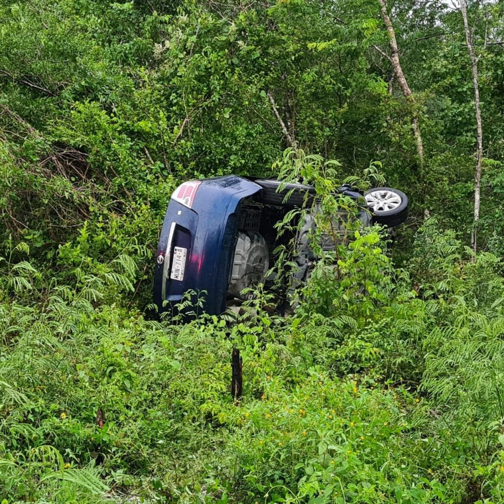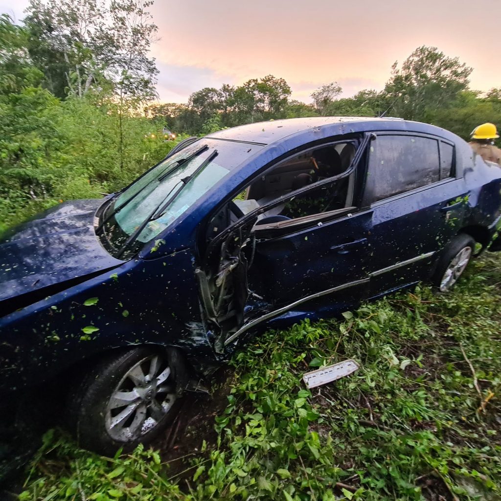 Kinchil, Yuc., a 10 de agosto 2022.- Una inexplicable volcadura sobrellevó una familia de Tabasco, que iba a bordo de un vehículo Sentra, al “amarrar” la guía, causando que se salgan muy cerca donde hace unas semanas se suscitó una lamentable tragedia en la Kinchil-Celestún.