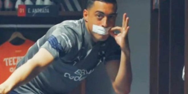Funes Mori apareció en el vestidor, con una cinta en la boca, haciendo con una mano el símbolo “amor y paz”, mientras que con la otra simulaba un cierre a la altura de los labios. Enseguida, el jugador de Monterrey trató de sacar algo de la bolsa y empezó a mover la cabeza y manos.