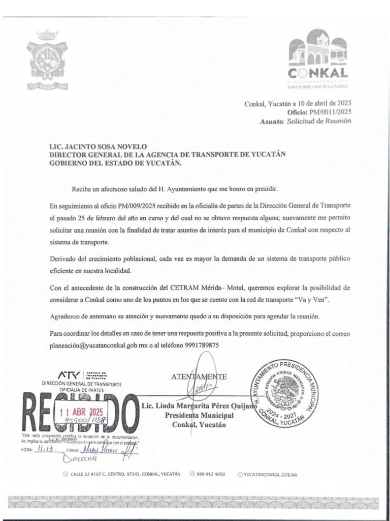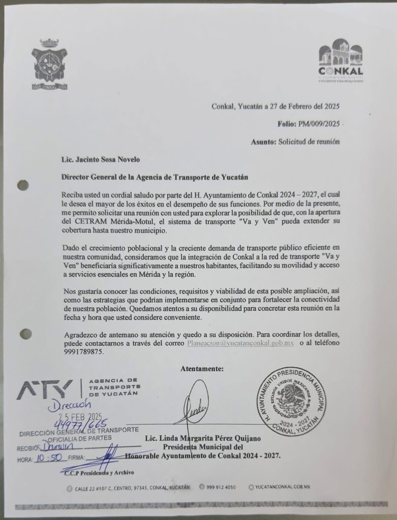 El primer oficio fue ingresado el 27 de febrero, con la intención de sostener una reunión para evaluar la viabilidad de que, con la apertura del CETRAM Mérida–Motul, el sistema “Va y Ven” pudiera extender su cobertura hacia esta zona en crecimiento. Posteriormente, el 10 de abril, se presentó un segundo oficio para reforzar la petición.