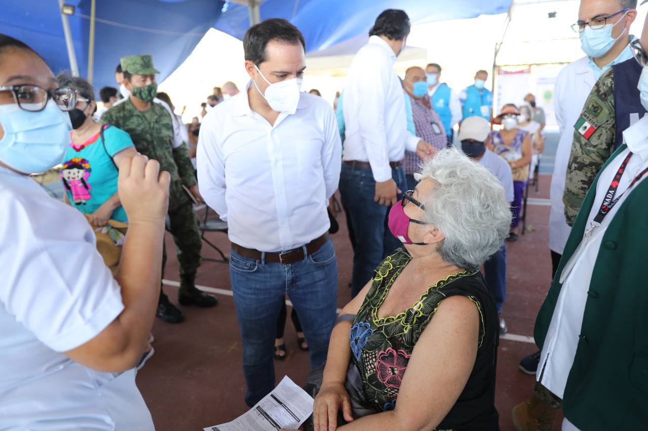Mérida, Yucatán, 17 de abril de 2021.- La vacunación contra el Coronavirus entre adultos mayores de Mérida ya rebasó las 100,700 dosis aplicadas después de 10 jornadas, pero el proceso todavía continúa durante este fin de semana y el lunes para este sector de la población de la capital yucateca, se informó en la visita que realizó el Gobernador Mauricio Vila Dosal por el módulo habilitado en la escuela Secundaria Técnica Número 75 del complejo habitacional Ciudad Caucel.