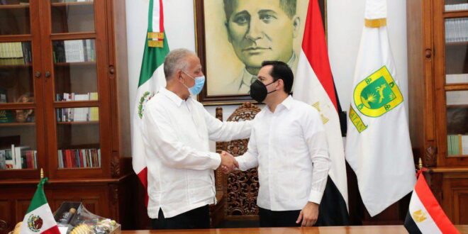 Mérida, Yucatán, 30 de marzo de 2022.- Yucatán y Egipto establecen lazos para trabajar de manera conjunta en las áreas de cultura, ciencia, educación, salud, turismo, deporte, medio ambiente y comercio, a través del intercambio de experiencias, luego de que el Gobernador Mauricio Vila Dosal y el embajador de la República Árabe de Egipto en México, Khaled Abdelrahman Shamaa, firmaran el Acuerdo de Cooperación y Amistad con la Gubernatura de Lúxor, Egipto.