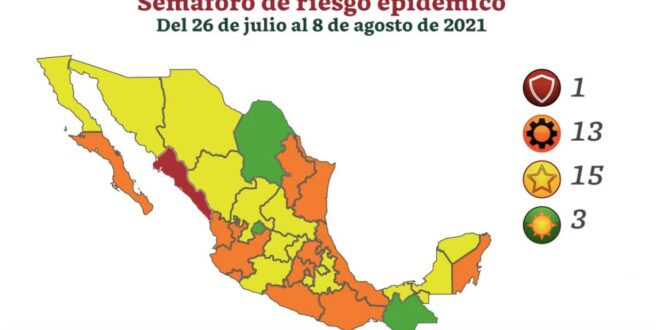 En el semáforo, que estará vigente a partir del lunes 26 de julio hasta el domingo 8 de agosto, un total de tres estados estarán en color verde, 15 en amarillo, 13 en naranja y uno en rojo.