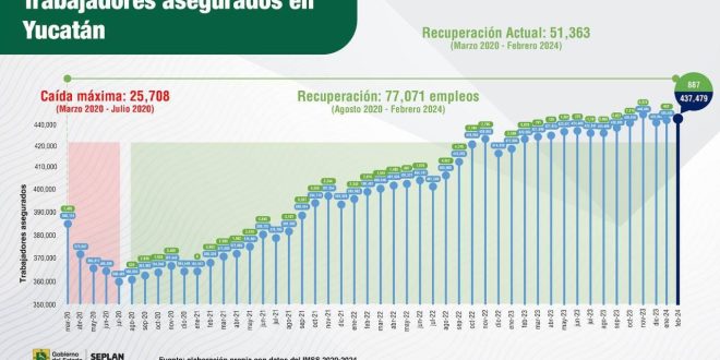 Mérida, Yucatán, 11 de marzo de 2024.- En Yucatán, juntos estamos mejorando la calidad de vida de las familias del estado, muestra de ello, en febrero pasado la entidad registró 437,479 trabajadores asegurados ante el Instituto Mexicano del Seguro Social (IMSS), lo que significó un crecimiento anual de 3.9%, respecto al mismo mes de 2023.