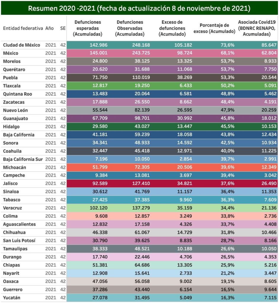 Esta lista continúa con Veracruz, con el 34.4%, Chiapas, 25.9%, y Jalisco, 37.6%. La cifra de excesos de defunciones compara los fallecimientos reportados por la autoridad con los registrados.