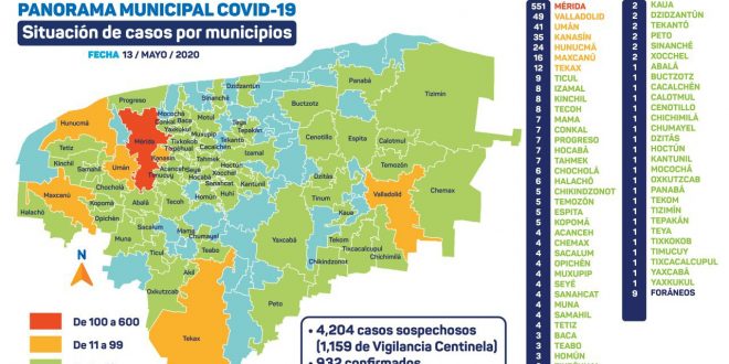Mérida, Yucatán, 13 de mayo de 2020.- Hoy se detectaron 41 nuevos contagios de Coronavirus: 22 en Mérida, 4 en Kanasín, 2 en Hocabá y Tecoh, y 1 en Hoctún, Hunucmá, Izamal, Kinchil, Motul, Muna, Samahil, Tahmek, Tekax, Tetiz y Valladolid. En total, ya son 932 casos positivos, 9 de los cuales son de otro país u otro estado.