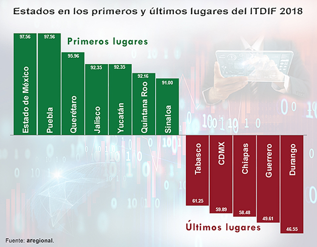 Al fondo de lista se encuentran Tabasco con calificación de 61.25, Ciudad de México con 59.89, Chiapas con 58.48, Guerrero con 49.61 y Durango con 46.55.