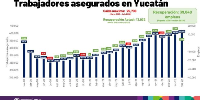 Mérida, Yucatán, 5 de abril de 2022.- Yucatán logró un nuevo récord histórico en generación de empleos, pues en el mes de marzo se registró un total de 400,048 trabajadores asegurados ante el Instituto Mexicano del Seguro Social (IMSS), cifra que es resultado de las acciones que en conjunto el Gobierno de Mauricio Vila Dosal y los yucatecos han impulsado a través de la promoción del estado a nivel nacional e internacional para atraer inversiones que generen más empleos y mejor pagados para las familias yucatecas.
