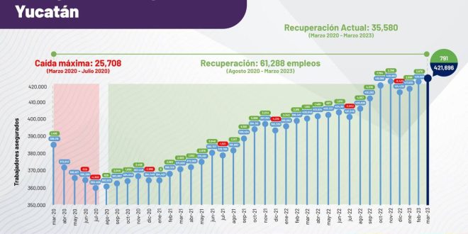 Mérida, Yucatán, 6 de abril de 2023.- Nuevamente, Yucatán obtuvo un máximo histórico en generación de empleos desde que se lleva registro, al alcanzar en marzo pasado la cantidad de 421,696 trabajadores asegurados ante el Instituto Mexicano del Seguro Social (IMSS), crecimiento que se ha mantenido durante 23 meses consecutivos, resultado de la promoción que impulsa el Gobernador Mauricio Vila Dosal en los niveles nacional e internacional para la atracción de más inversiones que generen mayores fuentes de empleos para los yucatecos.