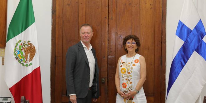 La titular de la Secretaría General de Gobierno (SGG), María Fritz Sierra, en representación del Gobernador Mauricio Vila Dosal, recibió este día en la sede del Poder Ejecutivo al diplomático finlandés, quien, en el marco de su participación en el Smart City Expo Latam Congress, realiza su primera visita oficial a Yucatán, tras haber asumido su cargo en septiembre de 2023.