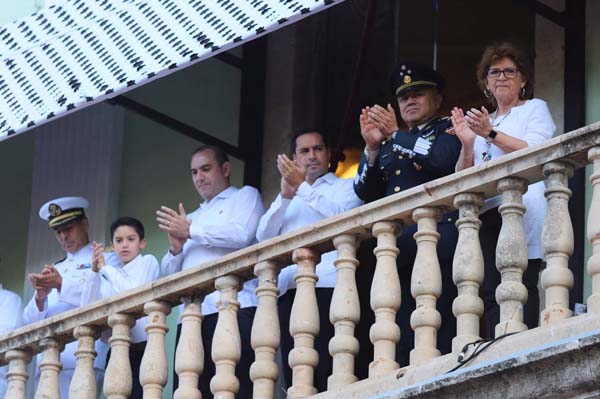 Posteriormente, Vila Dosal se trasladó al balcón principal del Palacio de Gobierno, desde donde dio su autorización para dar paso a los 5,483 elementos, distribuidos en 71 contingentes, en punto de las 8 horas, en una mañana que contó con un clima bastante agradable tanto para quienes participaron como para los que fueron apreciar el trayecto de la columna.